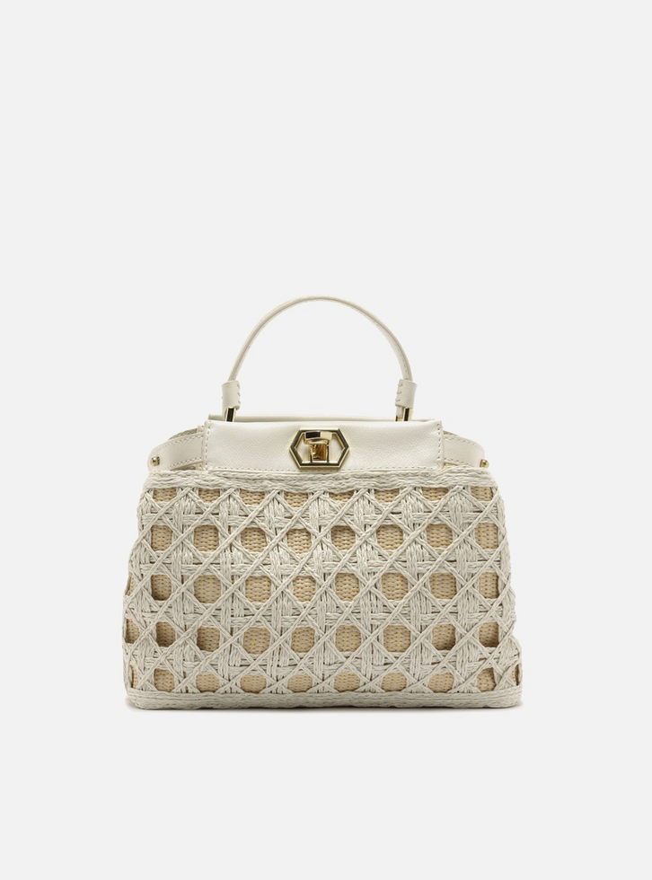 Bolsa tote média bege em couro e ráfia. O acessório tem formato estruturado, sob capa em ráfia natural e capa em ráfia tramada e bordada, que imita o efeito da palhinha natural. Traz alça longa lateral regulável e removível e alça de mão presa por metais dourados. Possui duas divisórias internas: uma com fecho em imã e outra com encaixe em peça metálica que se conecta a detalhe sextavado na capa. Conta ainda com tiras laterais com ajuste por rebites. Parte interna forrada.