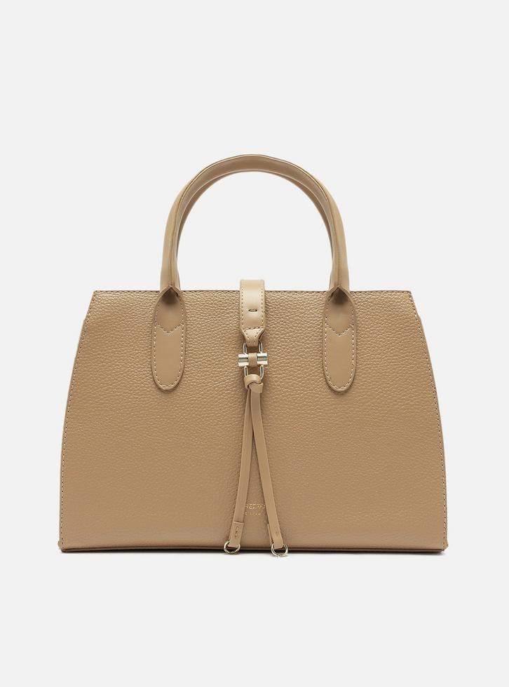 Bolsa tote grande bege. O acessório tem formato estruturado, acabamento texturizado e inscrição discreta do nome da marca. Traz alça tiracolo e alças de mão costuradas nas capas. Possui fecho superior em zíper e puxador em tira. Com detalhe de tira, peça de metal e mais duas tiras finas com ponteiras de argola presas sobre a capa frontal.