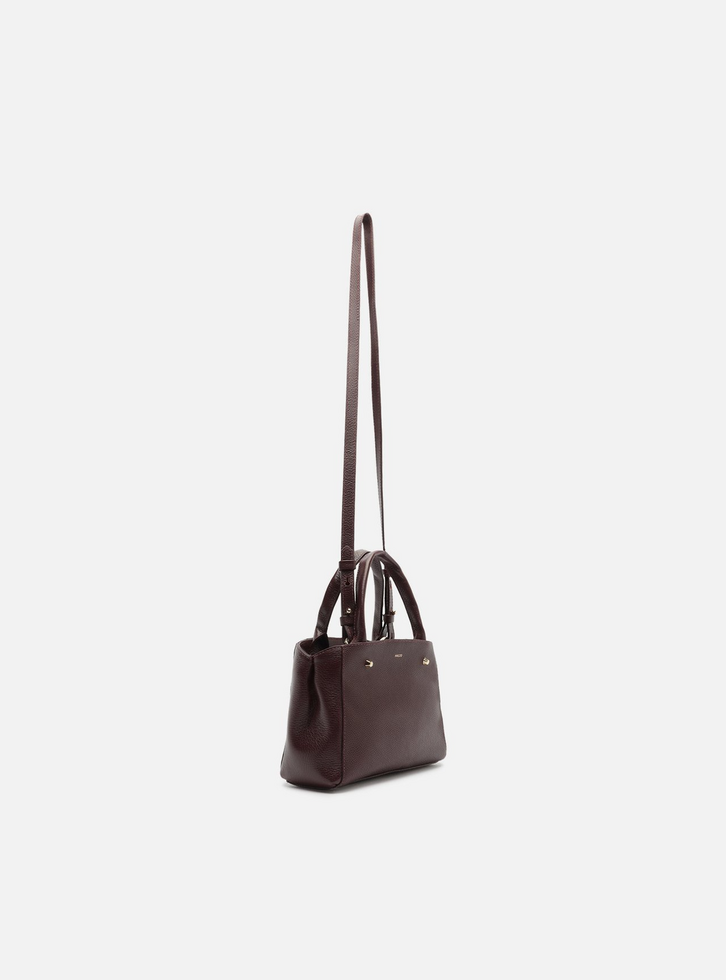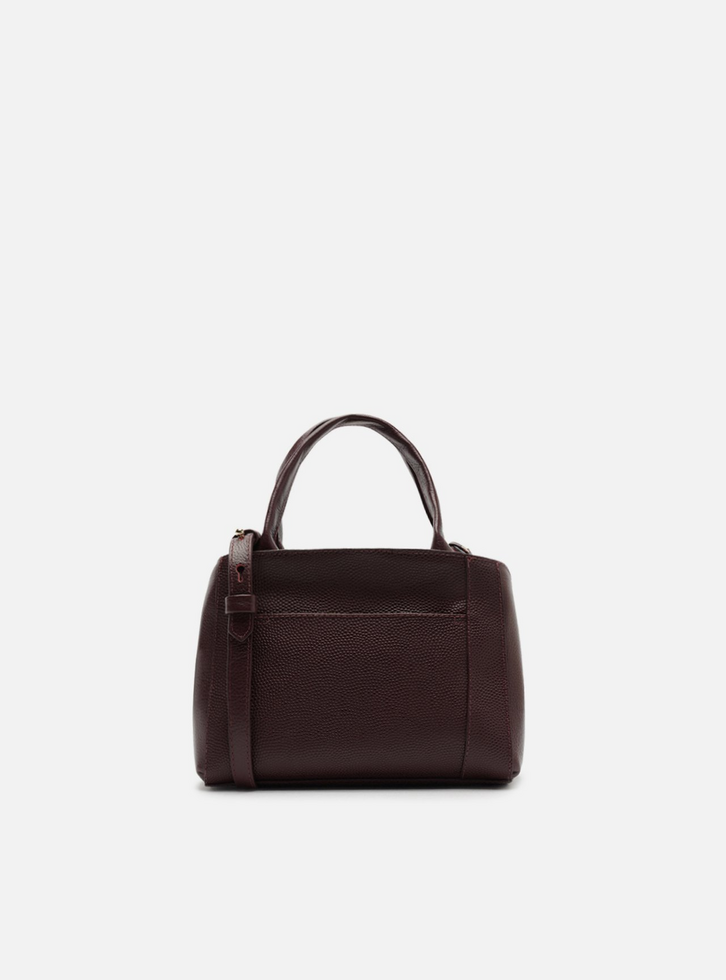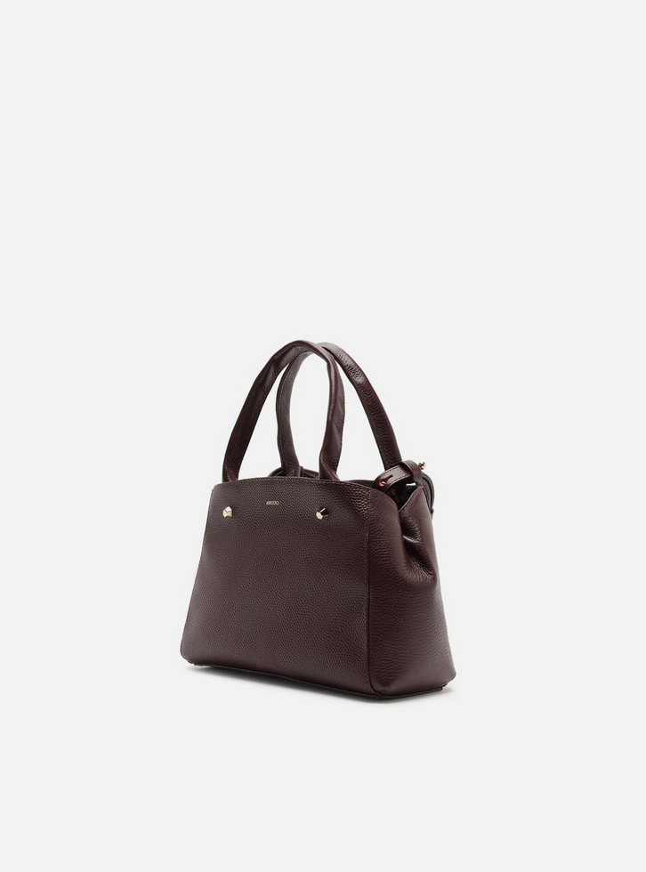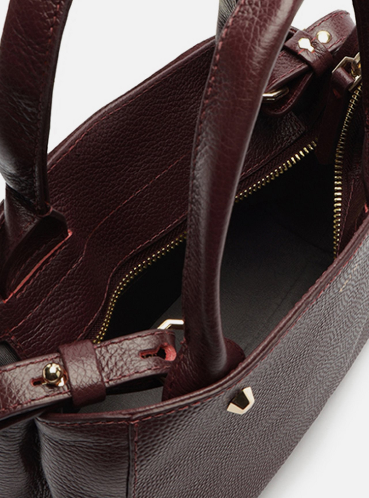 Bolsa tote feminina pequena de couro bordô. O acessório tem formato estruturado, acabamento texturizado e inscrição discreta do nome da marca, além de aplicação de rebites. Traz alça tiracolo fina regulável e removível e alças de mão estruturadas. Possui fecho superior em zíper com puxador em tira e acompanha bag charm em couro, preso à bolsa por tira fina.