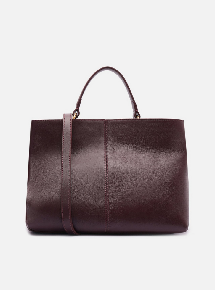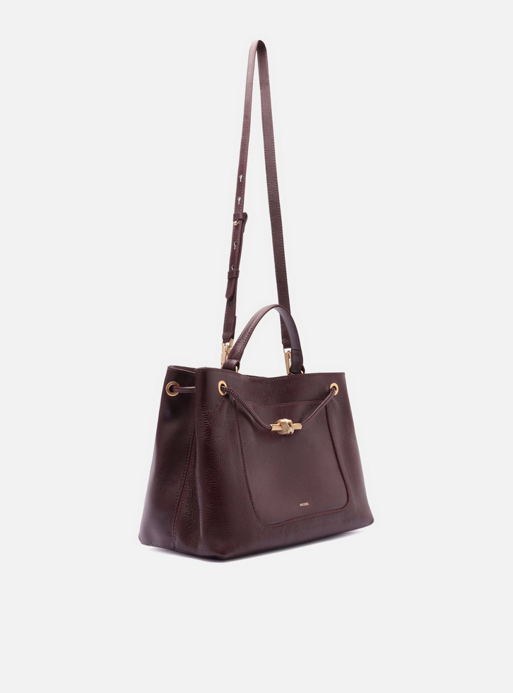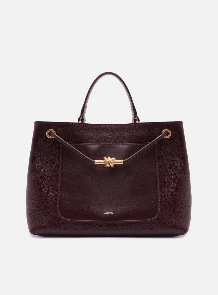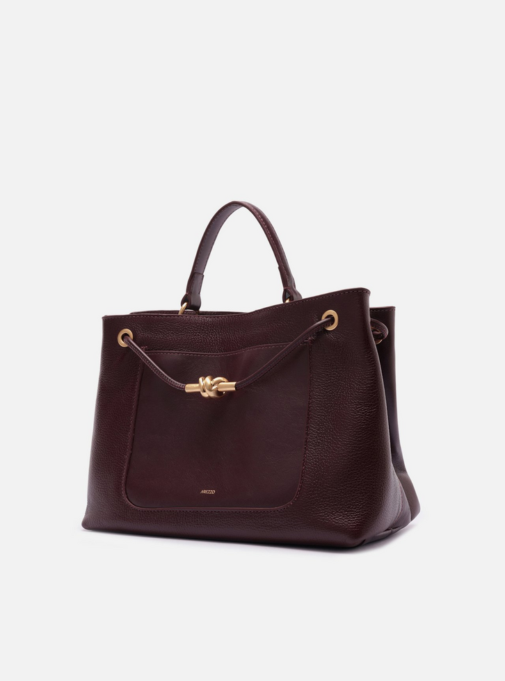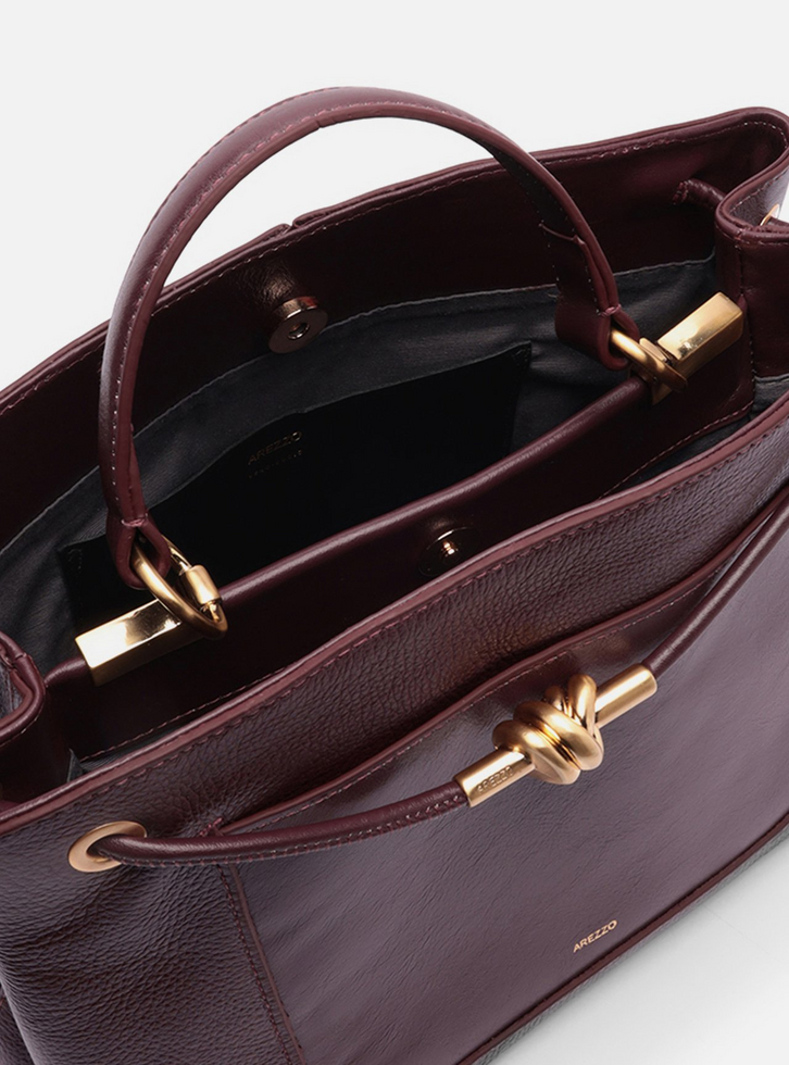 Bolsa tote grande em couro bordô. O acessório tem formato estruturado e acabamento macio. Traz alça tiracolo fina com regulagem e alça de mão presa por metais e argolas. Possui fecho em imãs e divisória interna. Com tira rolotê na parte superior, transpassada por ilhoses e com detalhe em peça de metal que remete a um nó, além de bolso externo frontal.