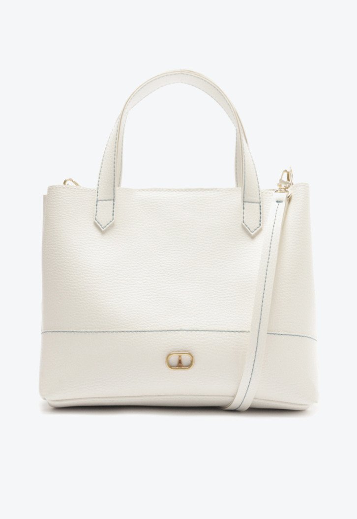Bolsa tote média com necessaire, na cor branca. O modelo de tamanho M é feito em material similar ao couro, com efeito texturizado soft. Com shape retangular e estruturado, traz duas alças de mão dobradas e uma alça transversal regulável e removível. Possui fecho superior por botão de pressão com ímã. Apresenta detalhe em costura pespontada em toda a borda inferior da peça, com aplicação de cápsula de metal com assinatura Anacapri, centralizada na capa frontal. O modelo acompanha necessaire grande, de mesmo tom da bolsa, com fecho superior em zíper metálico. O acessório pode ser utilizado separadamente da bolsa.