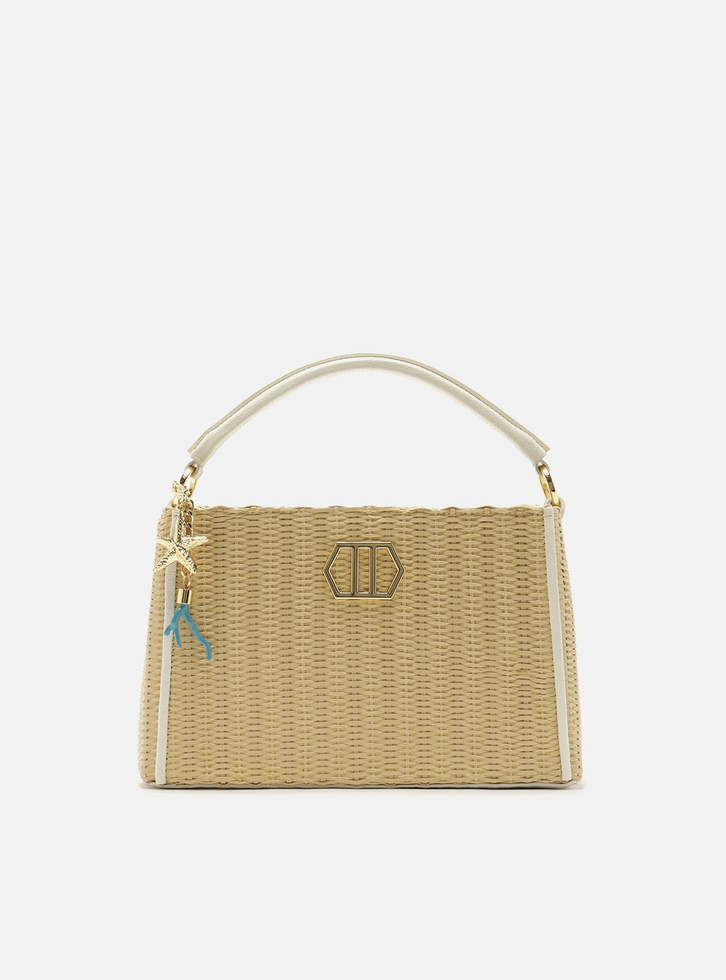 Bolsa feminina tote média em palha tramada e couro branco. O acessório tem formato estruturado, capas em palha tramada natural e acabamentos em couro liso branco nas laterais. Possui alça de mão superior e alça lateral regulável e removível. Conta com fecho superior e aplicação metálica geométrica. Acompanha bag charm em metal dourado em formato de estrela-do-mar e peça em acrílico em formato de alga.