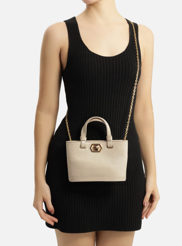 Bolsa tote pequena branca em couro. O acessório tem formato estruturado e acabamento texturizado, além de moldura. Traz fecho frontal em peça de metal, alças de mão e alça em corrente metálica fina removível.