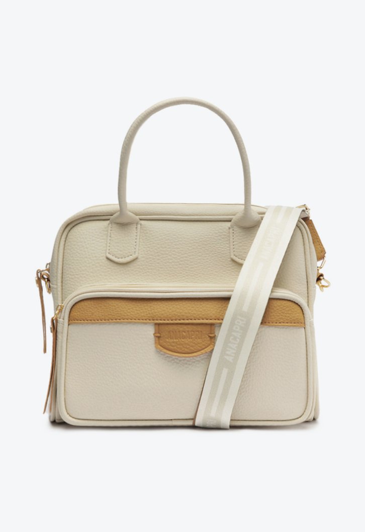 Bolsa tote Belle branca e marrom. O modelo estruturado de material similar ao couro com acabamento texturizado vem para a temporada em tamanho médio e possui duas alças de mão e outra alça transversal em gorgurão regulável e removível, com assinatura exclusiva Anacapri. De shape retangular, traz acabamento arredondado nos cantos. Forrada e com bolsinho na parte interna, ela possui fecho superior em zíper, com puxador em tira. No bolso externo, traz detalhe com aplicação de tira marrom e etiqueta personalizada, com assinatura Anacapri e fecho em zíper com puxador.