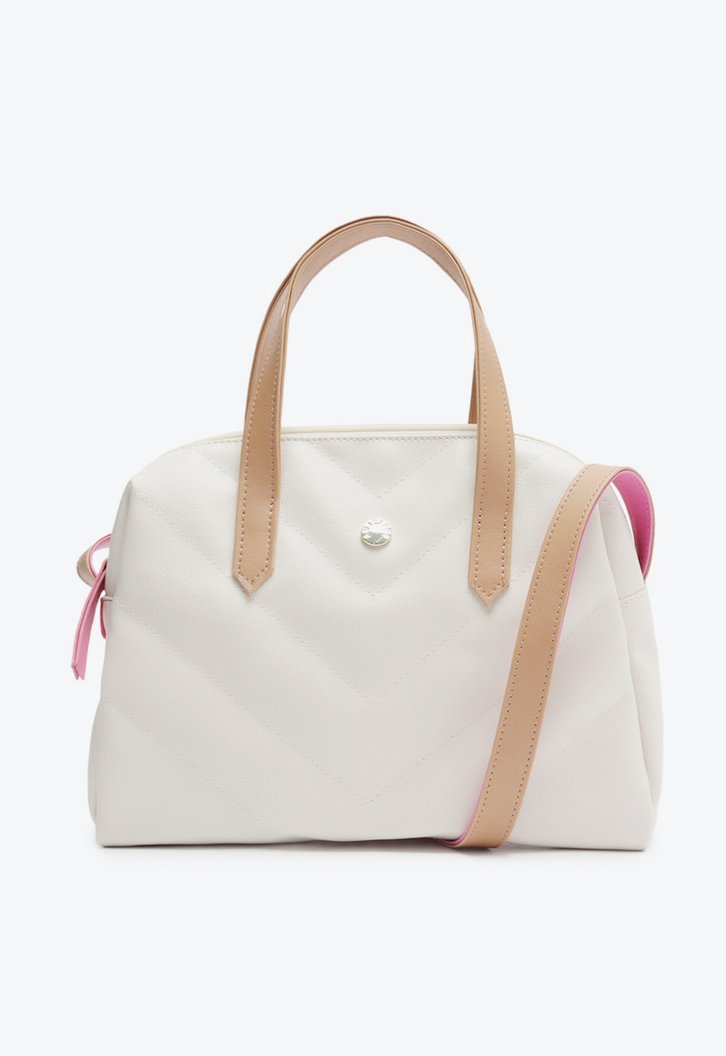 Bolsa tote Anacapri média branca e rosa fun. De material semelhante ao couro, o modelo acolchoado tem shape estruturado, laterais arredondadas e acabamento em costura moderna matelassê chevron na capa frontal. Traz alça transversal regulável em tira fina bicolor regulável e duas alças de mão. Detalhe para aplicação de etiqueta lateral com inicial “A” - assinatura Anacapri - carimbada. Apresenta fecho superior em zíper com puxador em tira. Com assinatura Anacapri em rebite redondo metálico aplicado na capa frontal.