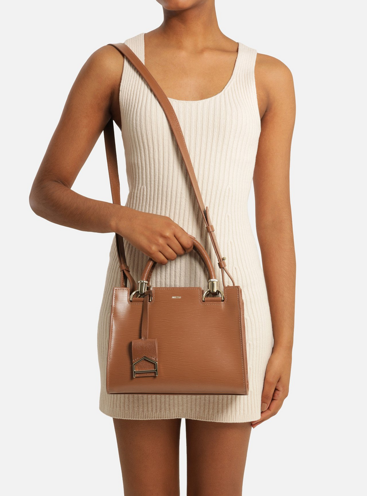 Bolsa tote média de couro marrom. O acessório tem formato estruturado, acabamento texturizado wave, recortes na parte superior para saída das alças e inscrição discreta do nome da marca. Traz alça tiracolo fina com regulagem e alças de mão presas por metais sextavados e argolas. Com fecho superior em zíper e puxador em tira. Acompanha bag charm em couro com detalhe em metal em forma de A geométrico, preso à bolsa por tira fina.