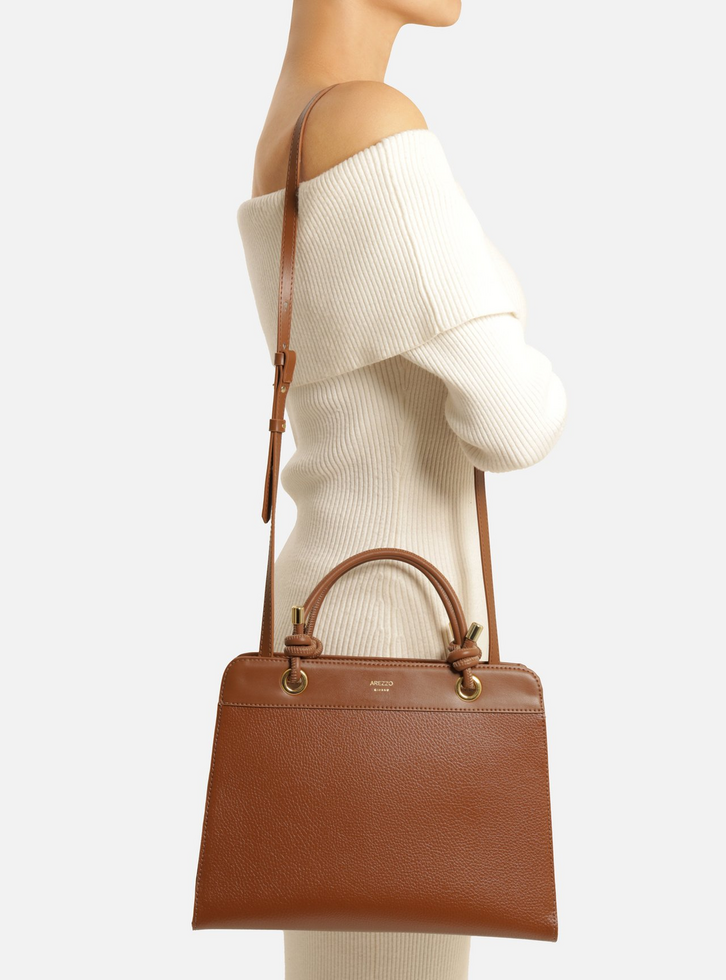 Bolsa tote média marrom. O acessório tem formato estruturado e acabamento texturizado. Traz alças de mão em tiras finas, rolotês, com enrolados nas pontas e presas por ilhoses, além de alça longa lateral regulável. Com fecho em zíper e puxador. Possui faixa lisa com inscrição do nome da marca na parte superior da capa.