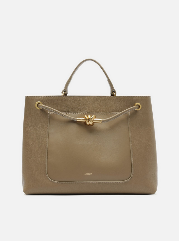 Bolsa tote grande em couro cinza. O acessório tem formato estruturado e acabamento macio. Traz alça tiracolo fina com regulagem e alça de mão presa por metais e argolas. Possui fecho em imãs e divisória interna. Com tira rolotê na parte superior, transpassada por ilhoses e com detalhe em peça de metal que remete a um nó, além de bolso externo frontal liso.