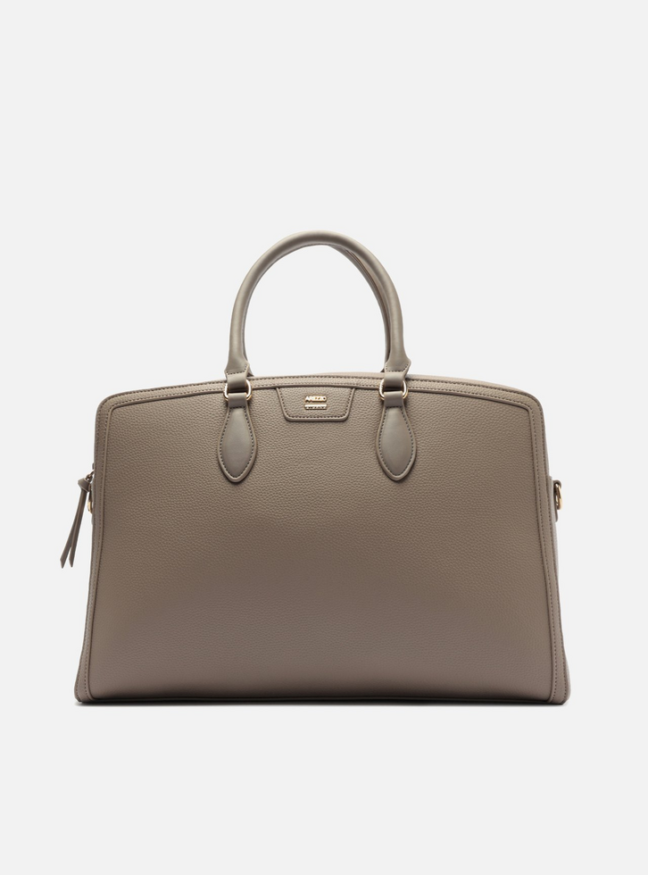 Bolsa feminina tote cinza grande. O acessório possui formato retangular e estruturado, com duas alças de mão fixas com reforço e aplicação de metal dourado na base. Possui fecho superior em zíper metálico. A parte superior traz uma faixa de couro lisa que percorre o topo da bolsa, com inscrição do nome da marca em relevo metálico. Conta com puxador alongado em tira e acabamentos laterais também em metal.