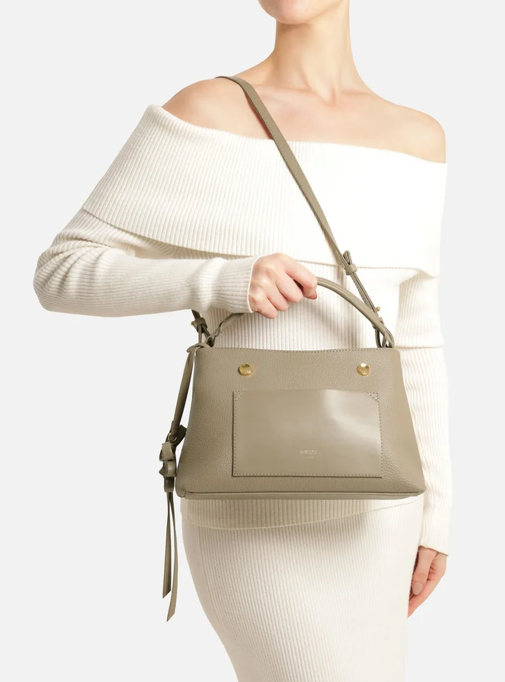 Bolsa tote média cinza. O acessório tem formato estruturado e acabamento texturizado. Possui alça de mão larga e curta, além de alça lateral longa com regulagem. Conta com fecho superior em zíper e divisória interna. Traz bolso frontal liso, detalhe em metais dourados e bag charm em tiras na parte frontal.