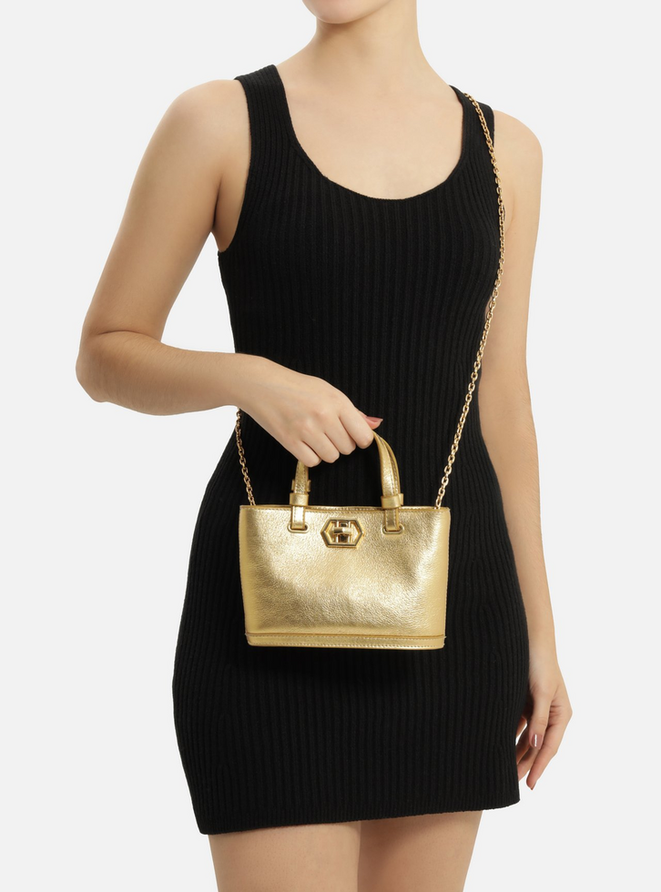 Bolsa tote pequena dourada em couro. O acessório tem formato estruturado e acabamento texturizado, além de moldura. Traz fecho frontal em peça de metal, alças de mão e alça em corrente metálica fina removível.