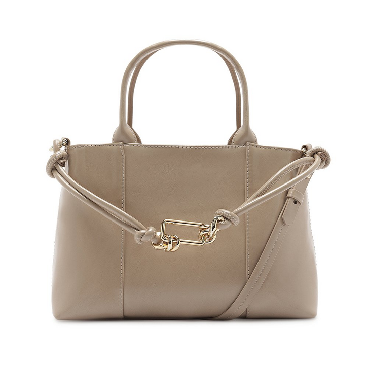 Bolsa tote média e estruturada, com detalhe em corrente, na cor bege. O modelo traz mix de materiais: detalhe central da capa em camurça e similar ao couro com acabamento envernizado. Com shape retangular e estruturado, traz alças de ombro fixas e uma alça longa transversal, regulável e removível. Com forro em tom rosê e bolsinho na parte interna. Detalhe para aplicação frontal de tira dupla bombada, com nós arrematando os elos centrais em correntaria metálica imponente. Apresenta fecho superior em zíper.