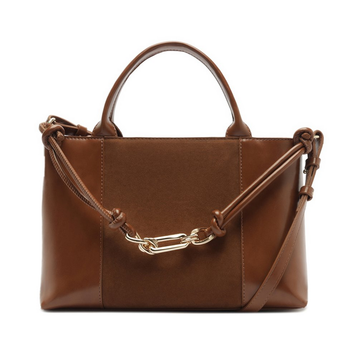 Bolsa tote média e estruturada, com detalhe em corrente, na cor marrom. O modelo traz mix de materiais: detalhe central da capa em camurça e similar ao couro com acabamento envernizado. Com shape retangular e estruturado, traz alças de ombro fixas e uma alça longa transversal, regulável e removível. Com forro em tom rosê e bolsinho na parte interna. Detalhe para aplicação frontal de tira dupla bombada, com nós arrematando os elos centrais em correntaria metálica imponente. Apresenta fecho superior em zíper.