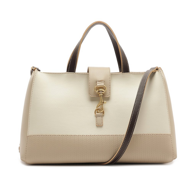 Bolsa tote média, nos tons de branco e bege. O modelo de tamanho M é feito em material similar ao couro. Com shape retangular e estruturado, traz duas alças de mão dobradas e uma alça longa e regulável. Ambas alças em tom azul. Apresenta detalhe em textura tramada bege em toda a borda inferior da peça. O modelo possui bolsinho na parte interna, no mesmo tom da bolsa. Apresenta fechamento por com lapela metálica com aplicação de um maxi mosquetão imponente - centralizado no adorno exclusivo.