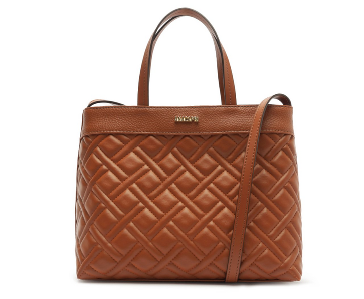 Bolsa tote grande marrom, em material similar ao couro. O modelo possui shape estruturado e amplo, com acabamento em matelassê geométrico por toda a capa frontal e traseira. Conta com duas alças de mão arredondadas e alça longa lateral removível e regulável, oferecendo diferentes formas de uso. Possui fechamento superior em zíper e aplicação de logo metálico discreto na parte frontal. Na parte interna, apresenta forro em tom neutro e bolso flat funcional.