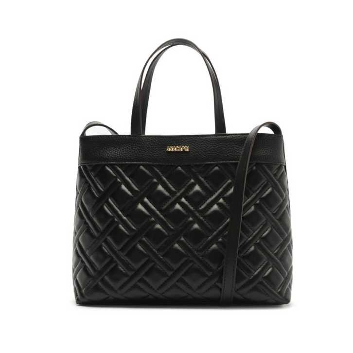 Bolsa tote grande preta, em material similar ao couro. O modelo possui shape estruturado e amplo, com acabamento em matelassê geométrico por toda a capa frontal e traseira. Conta com duas alças de mão arredondadas e alça longa lateral removível e regulável, oferecendo diferentes formas de uso. Possui fechamento superior em zíper e aplicação de logo metálico discreto na parte frontal. Na parte interna, apresenta forro em tom neutro e bolso flat funcional.