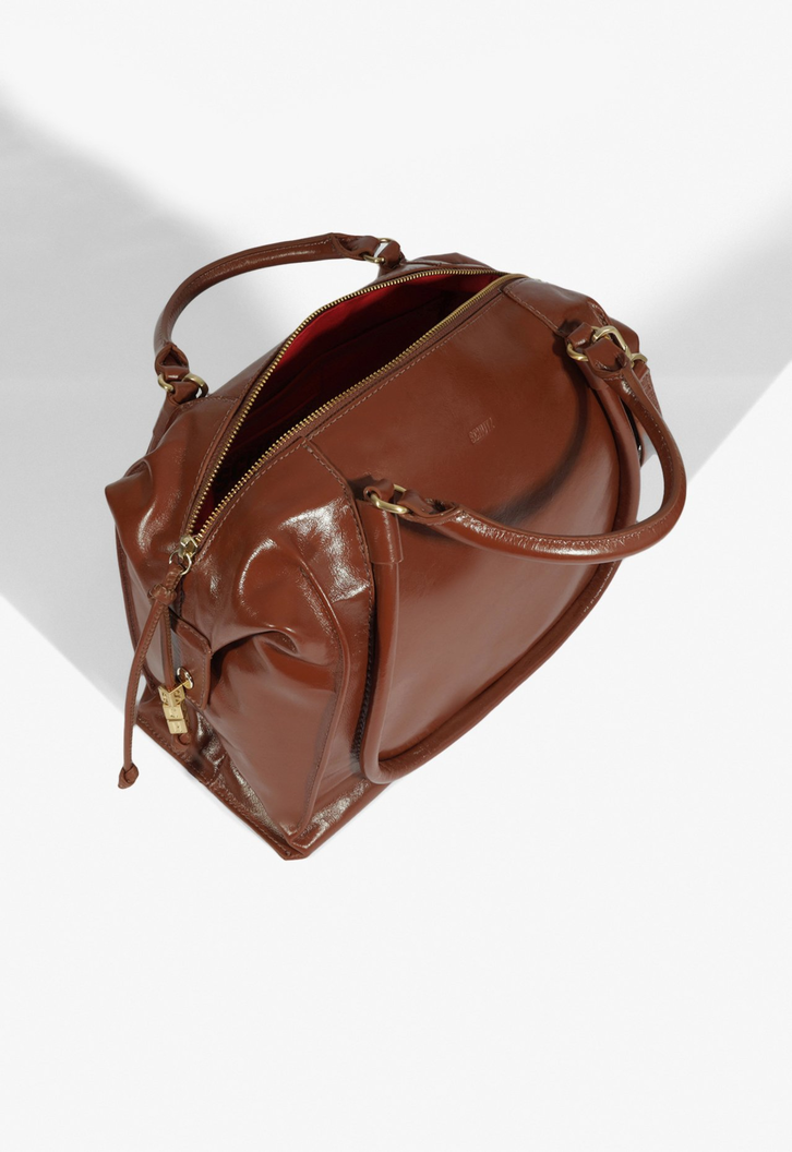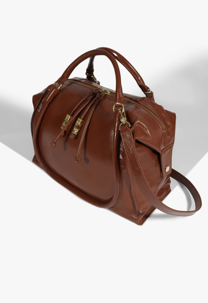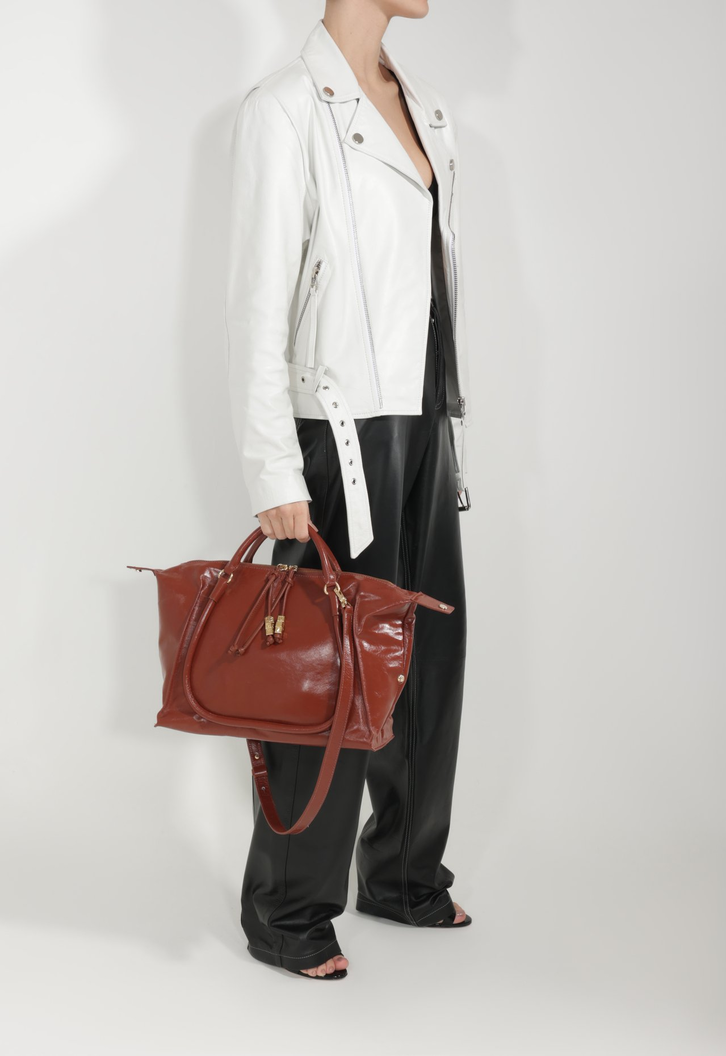 Essa tote bag é o must-have da temporada! Em couro, ela traz um detalhe em metal triangular que deixa a peça superestilosa. O fechamento de zíper que corre para os dois lados é ótimo para pegar suas coisas com praticidade, e o espaço interno é bem generoso, perfeito para quem gosta de estar preparada para tudo. Com uma alça longa que dá para usar do jeito que preferir, ela vai ser a sua aliada nos looks de todos os dias.