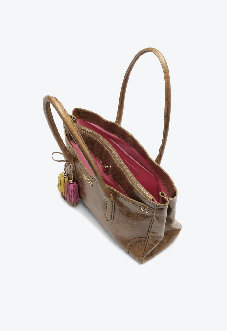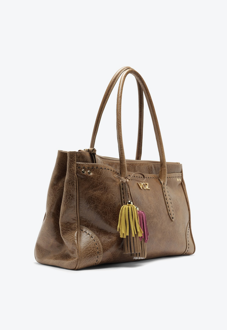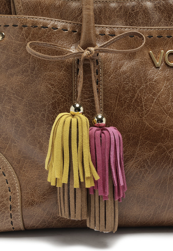 Bolsa grande em couro caramelo com alça de mão e chaveiro VCZ. Com estética boho, o modelo se destaca pelo acabamento que traz um visual artesanal e único ao acessório. Com tamanho espaçoso, é ideal para quem precisa levar vários itens com conforto e estilo. Perfeita para complementar looks casuais ou boho-chic, essa peça une funcionalidade e personalidade em um design marcante.
