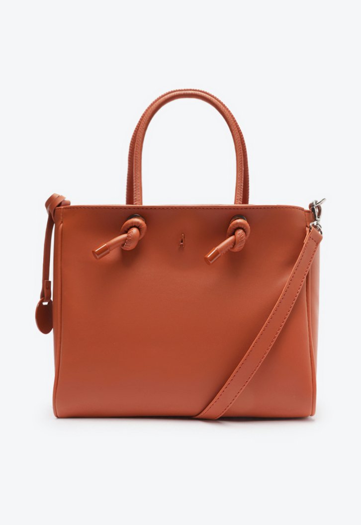 Bolsa tote média laranja em material semelhante a couro. O modelo tem formato estruturado e laterais retas. Traz alça lateral fina, alças de mão em tiras bombadas presas por nós e fecho superior em zíper com puxador em tira. Com pin metálico A na capa frontal, que representa a inicial do nome da marca, e bag charm em tira com peça redonda e inscrição Anacapri, preso na lateral.