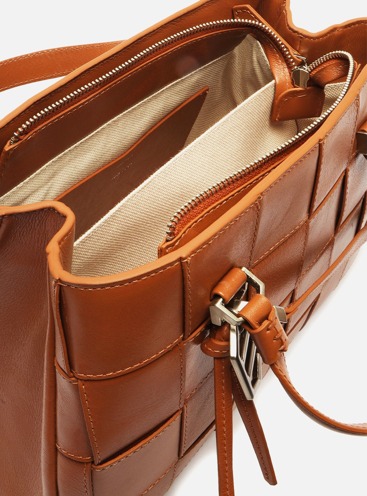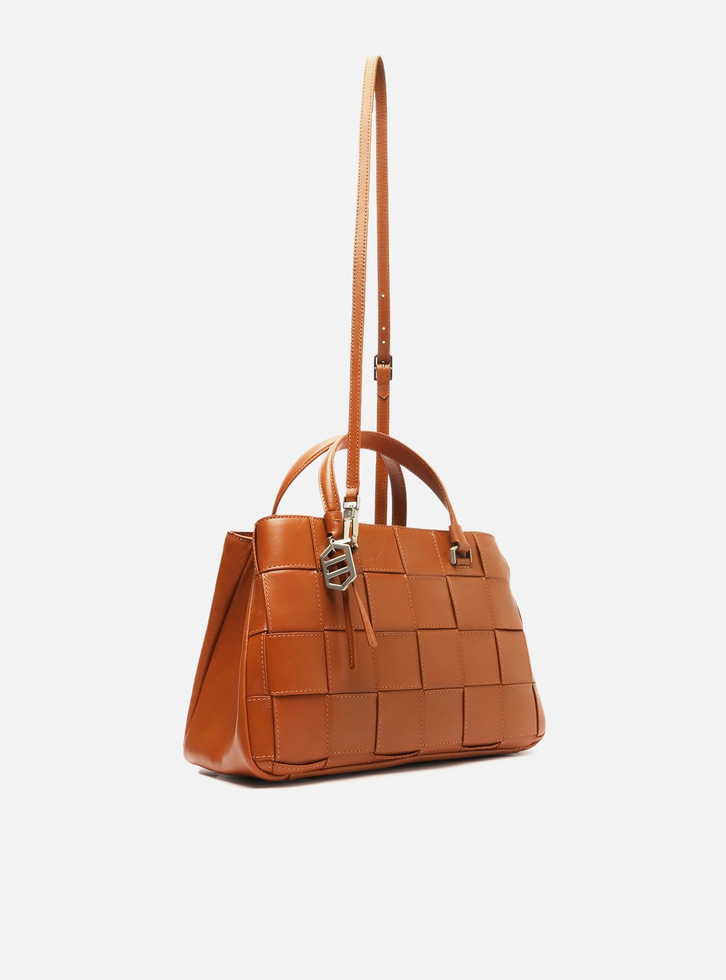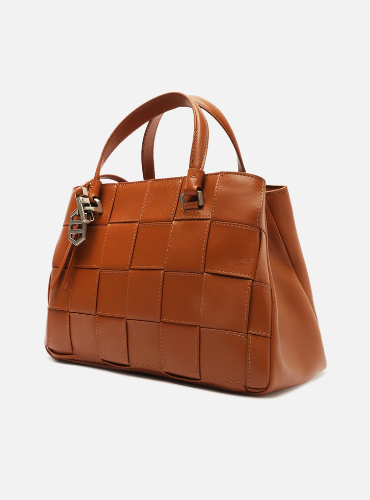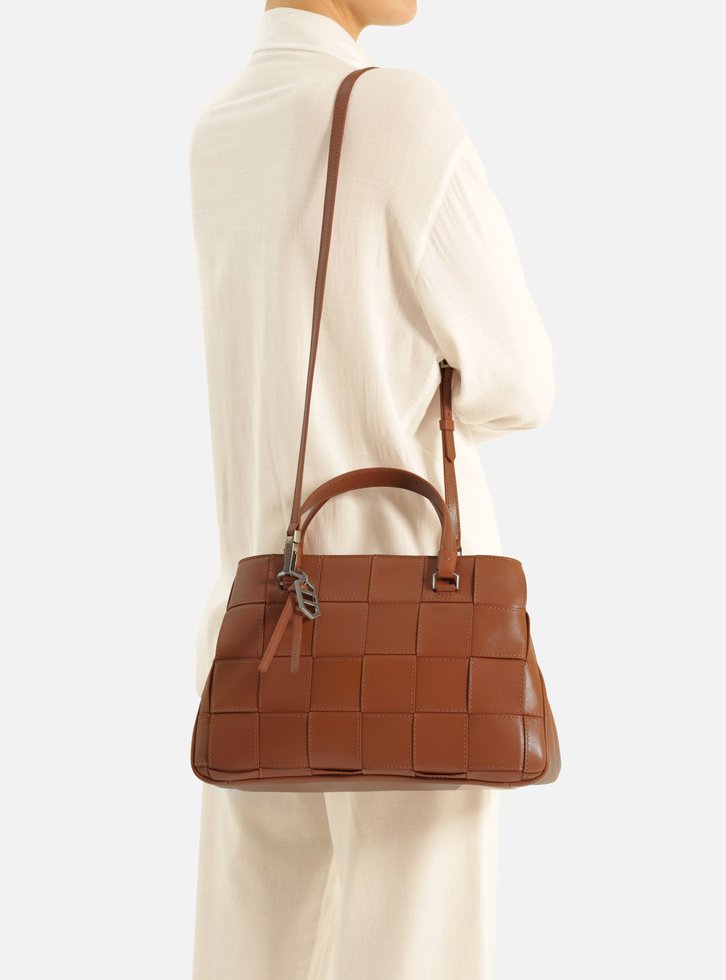 Bolsa feminina tote grande marrom de couro. O modelo tem formato estruturado e capas com tiras largas em tressê e costuras aparentes. Traz alça lateral fina regulável, duas alças de mão e fecho superior. Acompanha bag charm em metal geométrico e vazado.
