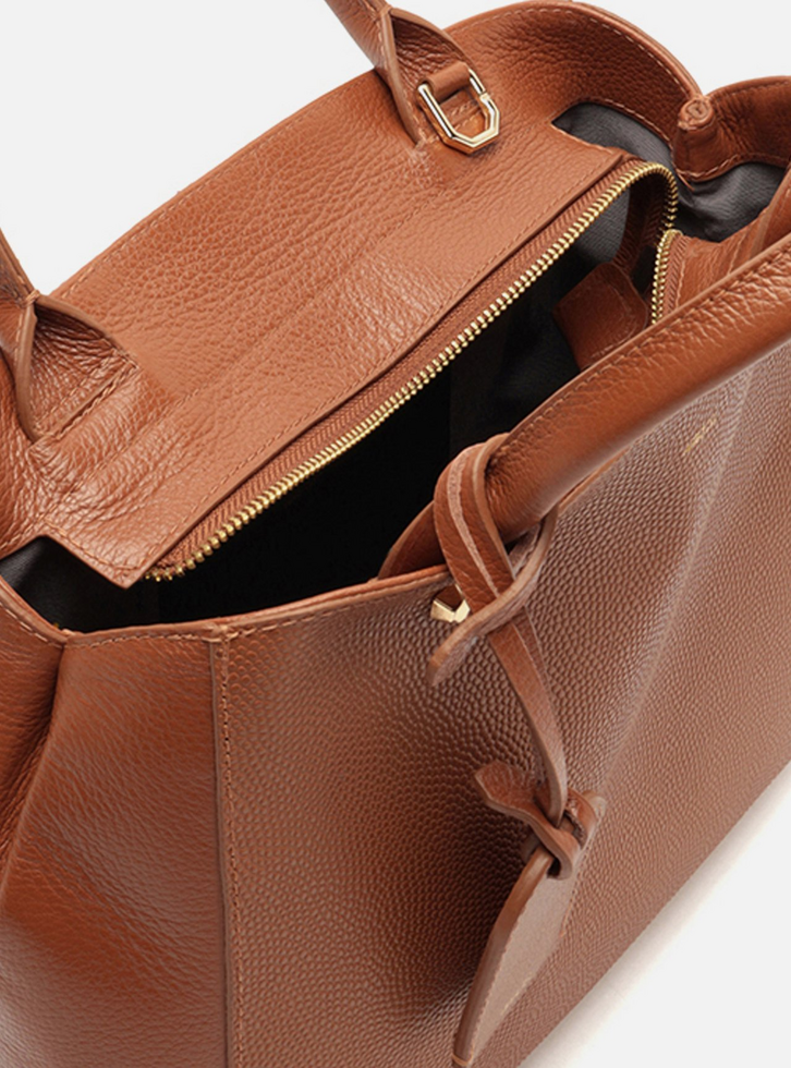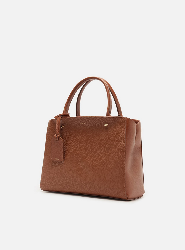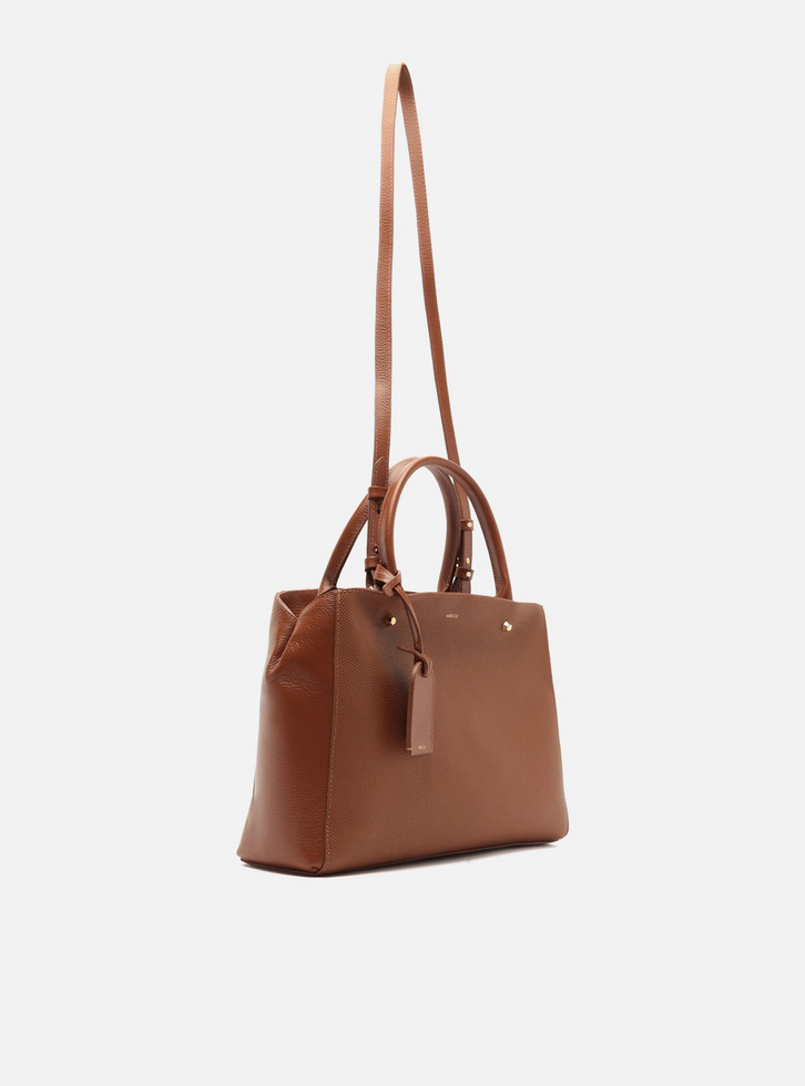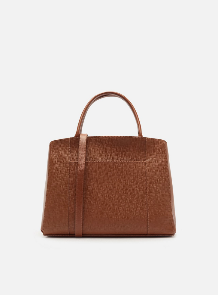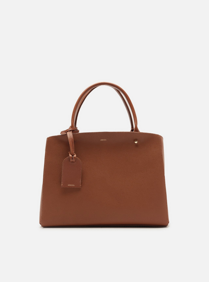 Bolsa tote feminina média de couro marrom. O acessório tem formato estruturado, acabamento texturizado e inscrição discreta do nome da marca, além de aplicação de rebites. Traz alça tiracolo fina regulável e removível e alças de mão estruturadas. Possui fecho superior em zíper com puxador em tira e acompanha bag charm em couro, preso à bolsa por tira fina.