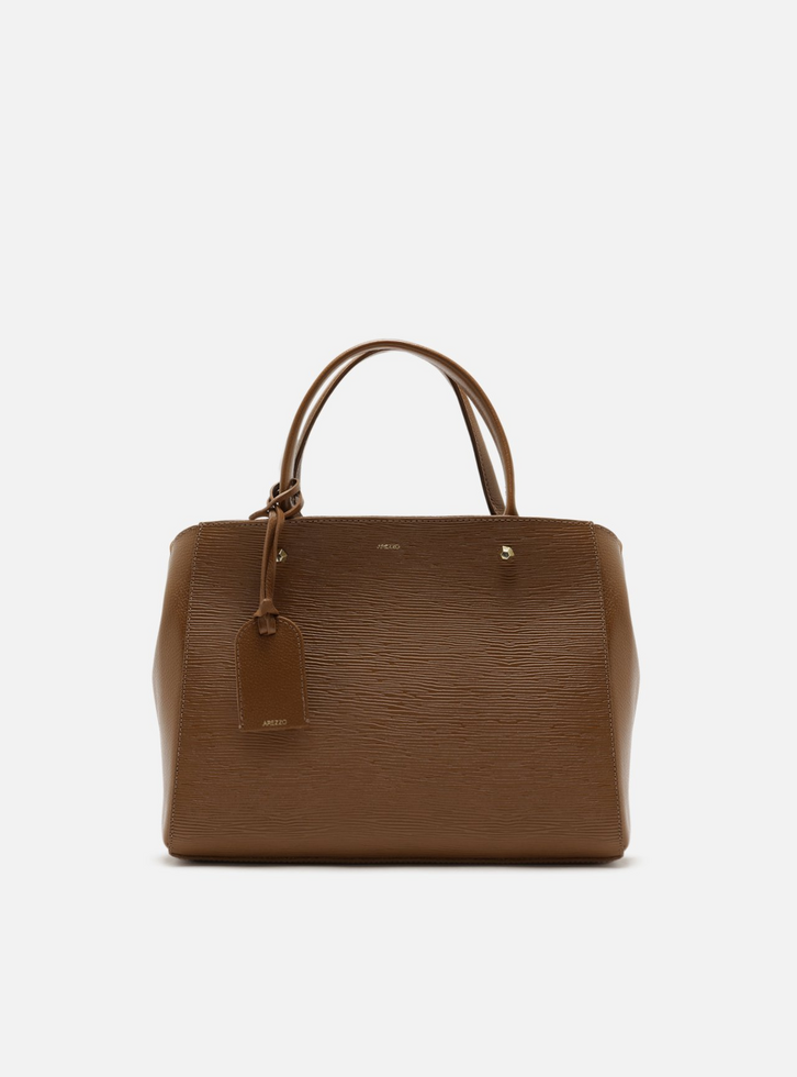 Bolsa tote feminina média de couro marrom. O acessório tem formato estruturado, acabamento texturizado e inscrição discreta do nome da marca, além de aplicação de rebites. Traz alça tiracolo fina regulável e removível e alças de mão estruturadas. Possui fecho superior em zíper com puxador em tira e acompanha bag charm em couro, preso à bolsa por tira fina.