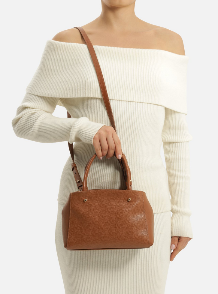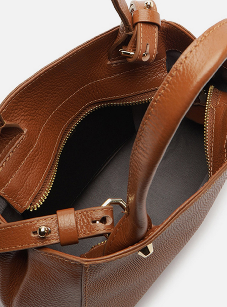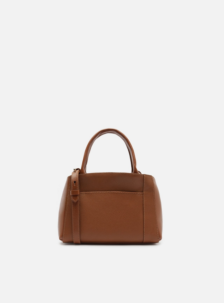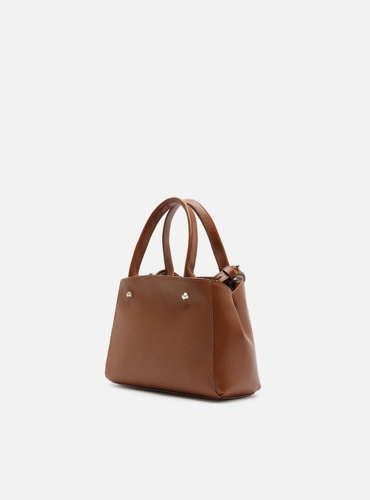 Bolsa tote feminina pequena de couro marrom. O acessório tem formato estruturado, acabamento texturizado e inscrição discreta do nome da marca, além de aplicação de rebites. Traz alça tiracolo fina regulável e removível e alças de mão estruturadas. Possui fecho superior em zíper com puxador em tira e acompanha bag charm em couro, preso à bolsa por tira fina.