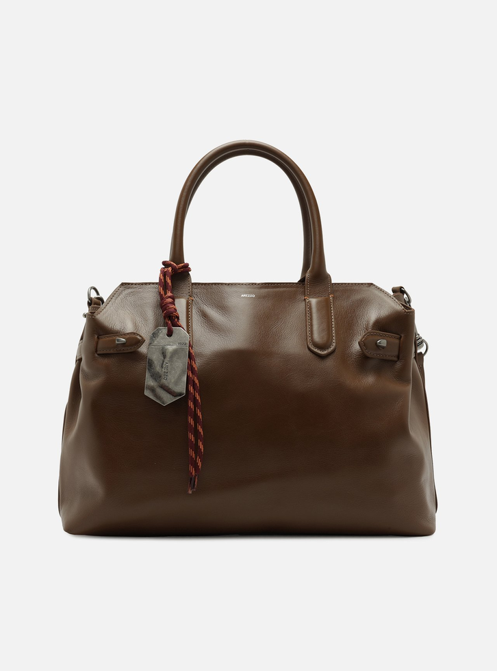 Bolsa tote grande de couro marrom com acabamento macio. O acessório tem formato macio e tiras com rebites nas laterais. Traz alça tiracolo regulável e alças de mão estruturadas. Com bag charm em peça de metal com efeito amassado e tira de cordão em cor contrastante presa à alça.