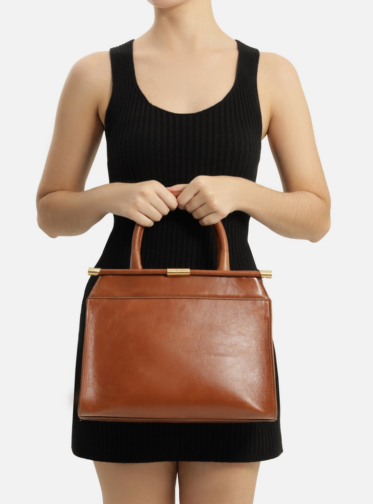Bolsa tote feminina grande marrom em couro. O acessório tem formato estruturado e acabamento liso e macio, com recorte geométrico na parte superior da capa e tira rolotê com detalhes metálicos. Traz duas alças de mão estruturadas e alça lateral longa com regulagem. Possui fecho superior em zíper com puxador e interior forrado.