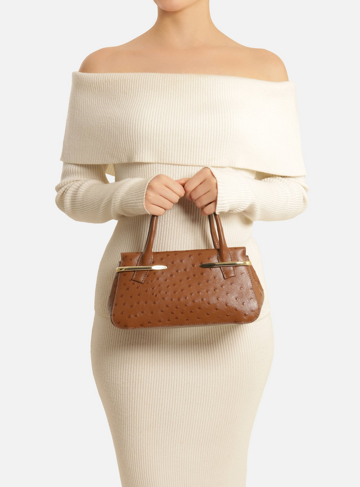 Bolsa tote média de couro marrom com textura e relevo em bolinhas. O acessório tem formato estruturado, com base maior e laterais arredondadas. Traz duas alças de mão estruturadas e alça lateral longa regulável e removível, presa por ganchos metálicos. Possui fecho superior em ímã interno. Apresenta detalhe na capa frontal em metais dourados, com nome da marca, que funcionam como porta-alça.