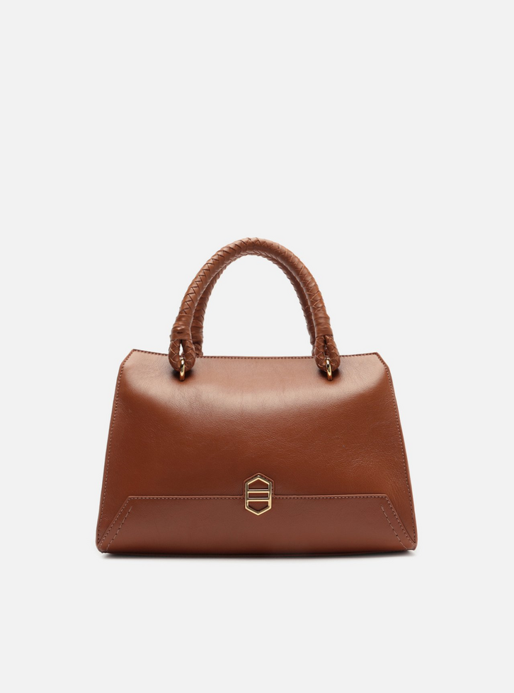 Bolsa feminina tote média em couro marrom. O acessório tem formato estruturado, capas em couro texturizado e moldura lisa na base. Traz duas alças de mão grossas trançadas e alça lateral regulável e removível, oferecendo diferentes formas de uso. Possui fecho superior em zíper com puxador, além de detalhe frontal metálico e geométrico em dourado.