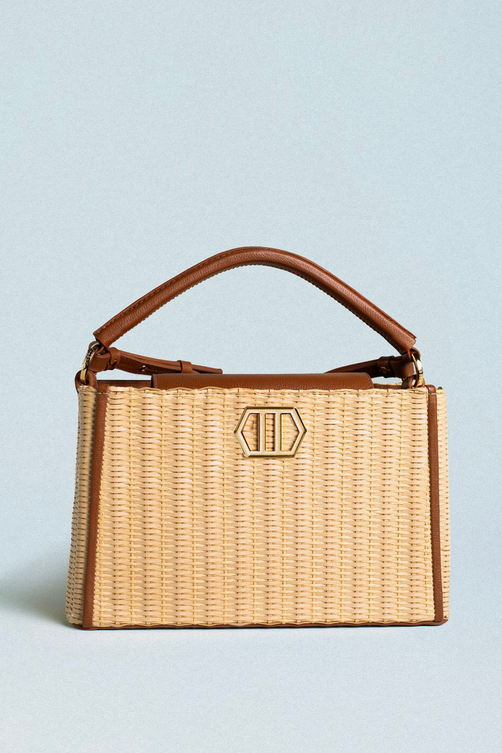 Bolsa feminina tote média em palha tramada e couro marrom. O acessório tem formato estruturado, capas em palha tramada natural e acabamentos em couro liso marrom nas laterais. Possui alça de mão superior e alça lateral regulável e removível. Conta com fecho superior e aplicação metálica geométrica. Acompanha bag charm em metal dourado em formato de estrela-do-mar e peça em acrílico em formato de alga.