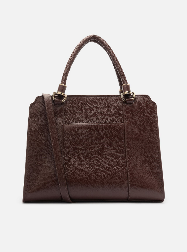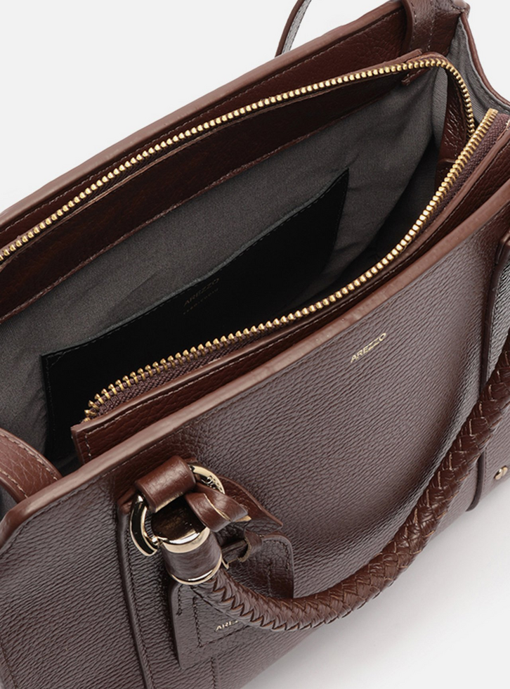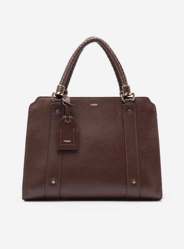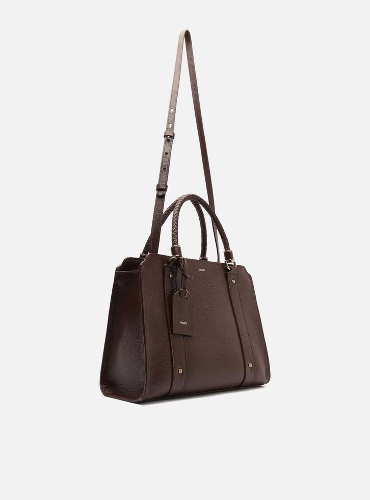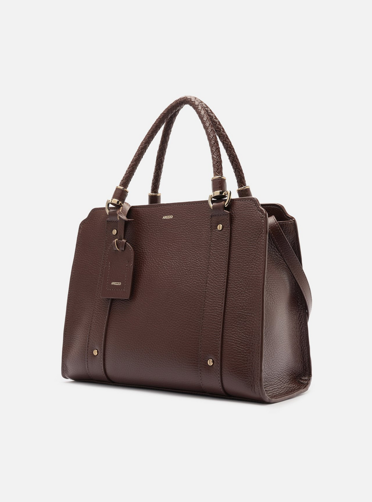 Bolsa tote grande de couro marrom. O acessório tem formato estruturado, acabamento texturizado e tiras sobre a capa frontal com rebites. Traz alça tiracolo fina com regulagem e alças de mão em tramado manual, presas por ilhoses metálicos. Possui fecho superior em zíper e puxador. Com forro e bolso externo traseiro. Acompanha bag charm preso por tira a uma das alças.