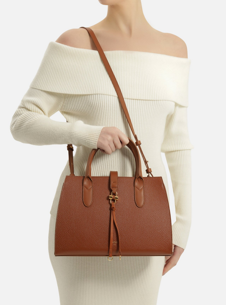 Bolsa tote grande marrom. O acessório tem formato estruturado e acabamento texturizado. Traz duas alças de mão e alça tiracolo regulável. Possui fecho superior em zíper. Conta ainda com lapela, presa por imã, com metal e tiras frontais.