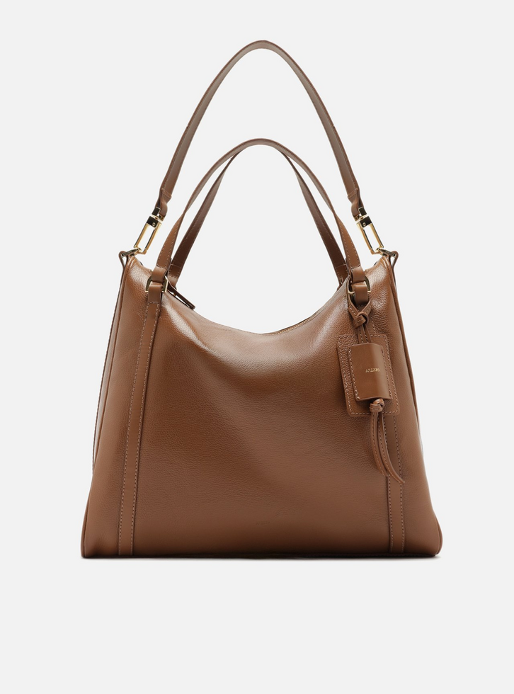 Bolsa tote grande marrom. O modelo possui duas alças de ombro e uma alça longa. Conta com fechamento superior em zíper, tag lateral personalizada e ferragens em metal dourado.