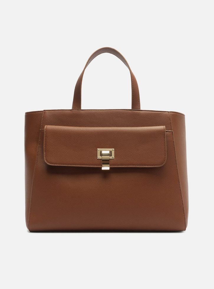 Bolsa feminina tote grande marrom. O acessório possui formato estruturado e acabamento levemente granulado. Apresenta alças de mão médias e bolso frontal com tampa e fecho metálico dourado. Possui fecho superior em zíper para maior segurança e espaço interno amplo.