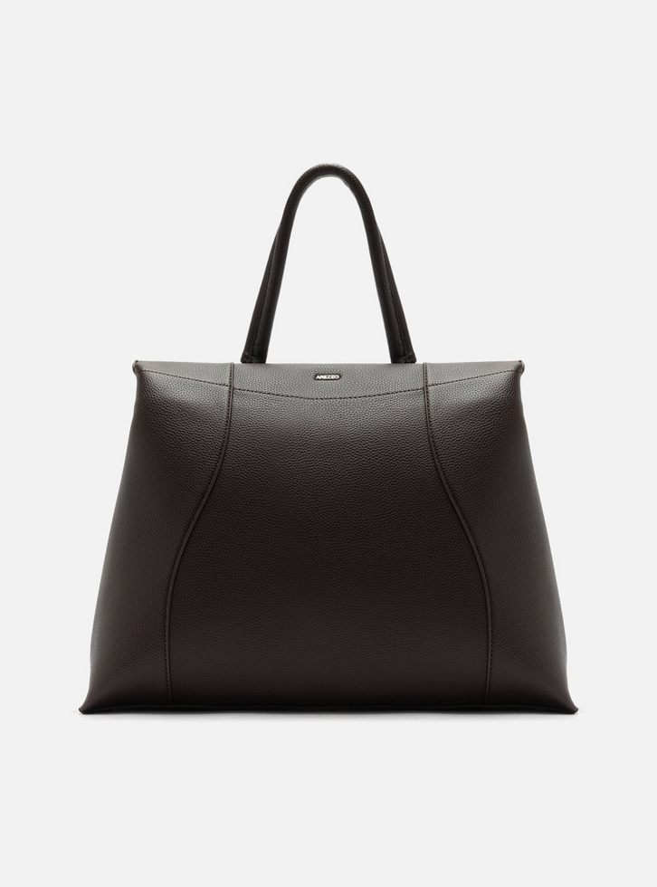 Bolsa tote grande em couro marrom. O acessório tem formato estruturado e acabamento texturizado. Traz alças de ombro médias e detalhe em costuras curvas na parte frontal. Possui fecho superior em zíper e nome da marca em metal na capa.