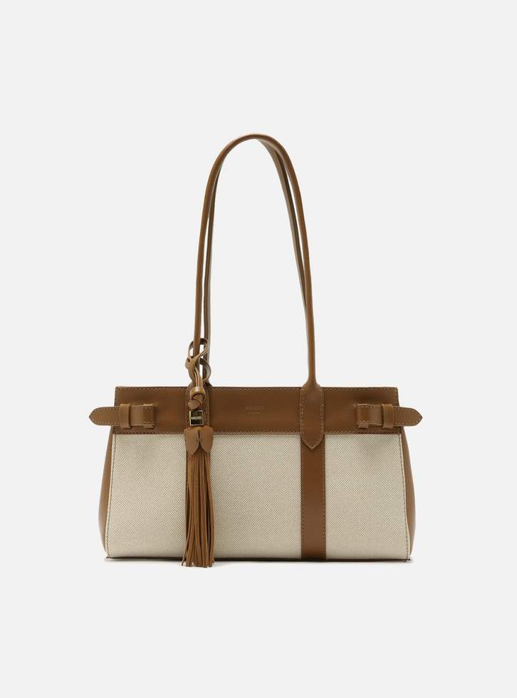 Bolsa tote média em linho com detalhes em material marrom. O acessório tem formato estruturado, capa em linho e tiras sobrepostas marrons. Traz duas alças de ombro. Possui detalhe em tiras nas laterais da parte superior, como extensores, e fecho superior em zíper. Conta ainda com bag charm em barbicacho de camurcina e metal, preso à alça da bolsa por tira.
