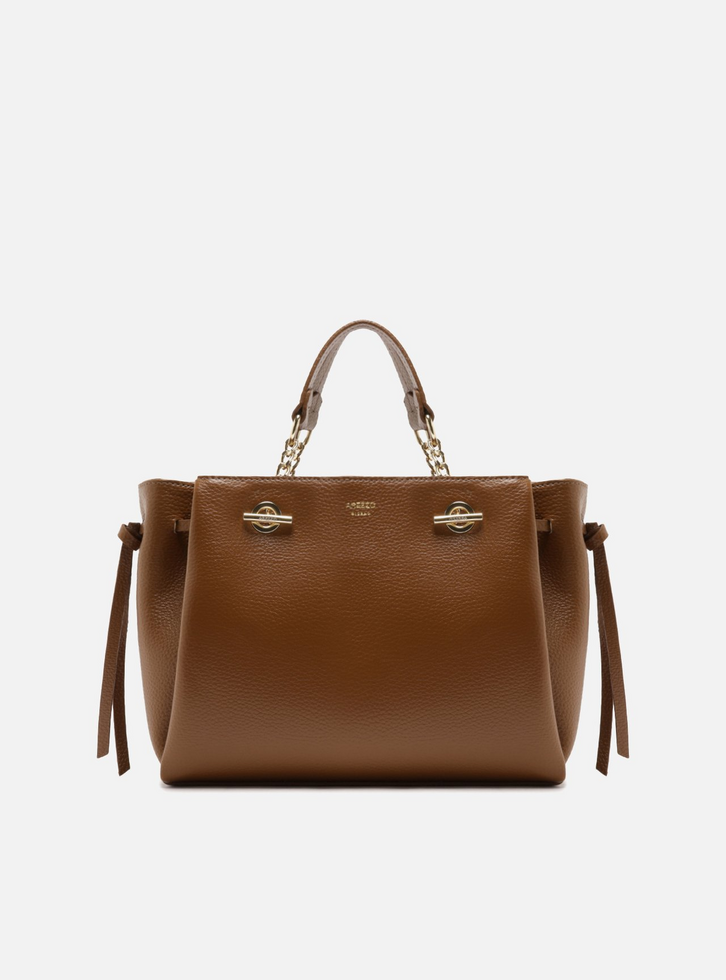 Bolsa tote média marrom. O acessório tem formato estruturado e acabamento texturizado. Traz duas alças de mão presas por mini correntes metálicas, que passam por ilhoses vazados nas capas e são fixadas por peças metálicas. Possui ainda alça lateral regulável e tiras com nós nas laterais para ajuste. Conta com fecho superior em zíper e puxador, além de forro interno colorido e bolsos organizadores.