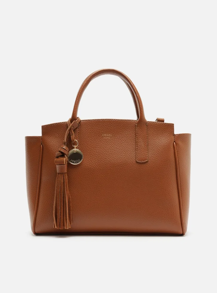 Bolsa tote feminina grande marrom. O acessório tem formato retangular e estruturado, laterais arredondadas e acabamento texturizado. Traz duas alças de mão e alça lateral longa em tira com regulagem. Possui fecho superior em zíper com puxador e acompanha dois bag charms: um em barbicacho de camurcina e outro em metal com o nome da marca. Com interior forrado.