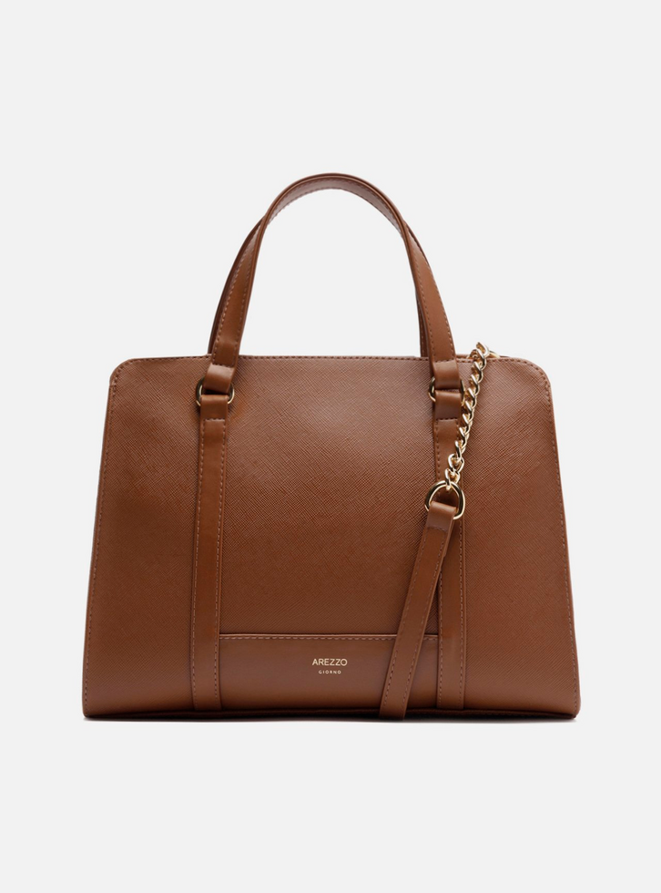 Bolsa feminina tote grande marrom. O acessório tem formato estruturado e acabamento levemente texturizado wave. Possui duas alças de mão presas por argolas e conectadas a tiras sobre as capas na vertical, além de alça longa lateral regulável em tiras e correntes metálicas. Fecho superior em zíper e recorte na base com nome da marca.