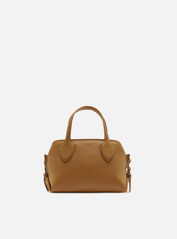Bolsa tote pequena marrom. O acessório tem formato estruturado e acabamento texturizado. Traz duas alças estruturadas com porta-alça na capa e alça lateral longa regulável. Possui fecho superior em zíper, além do nome da marca na capa. Detalhe nas laterais com base dobrada e tiras com fivelas.