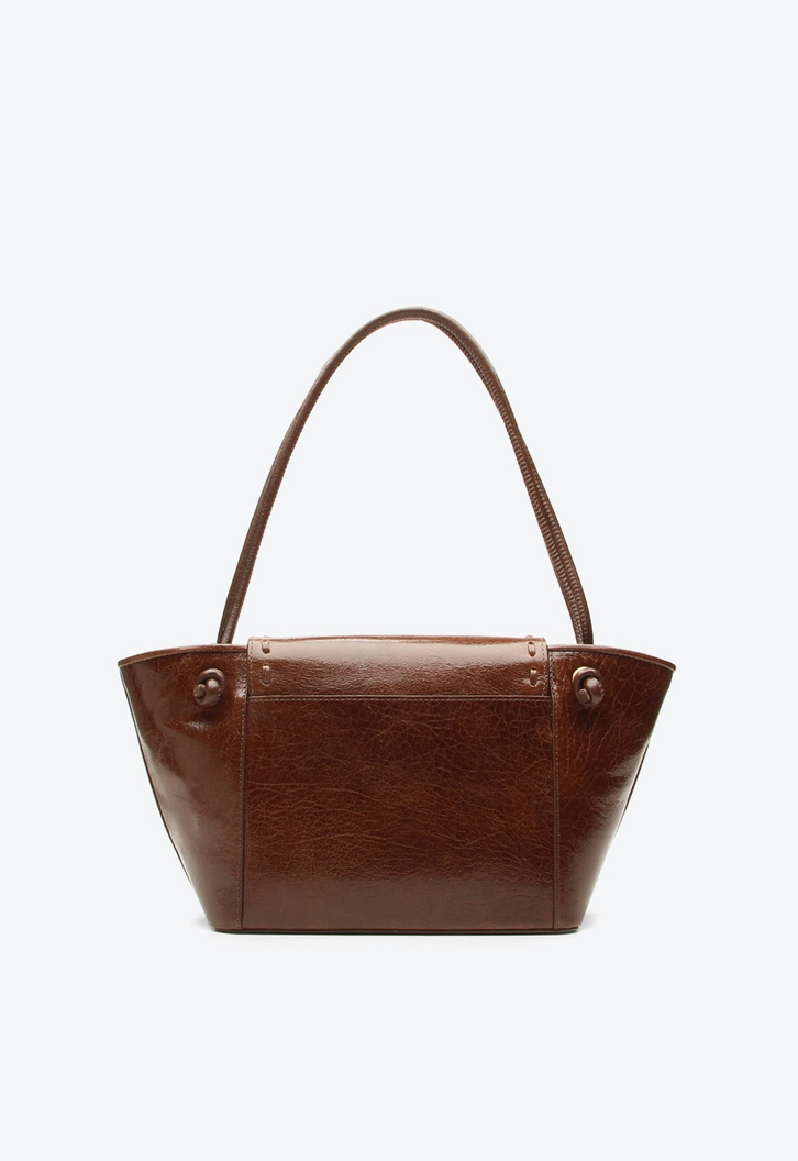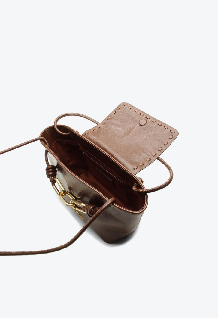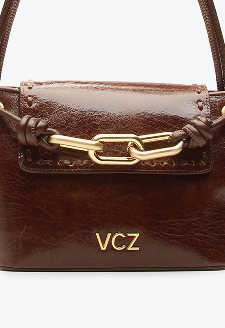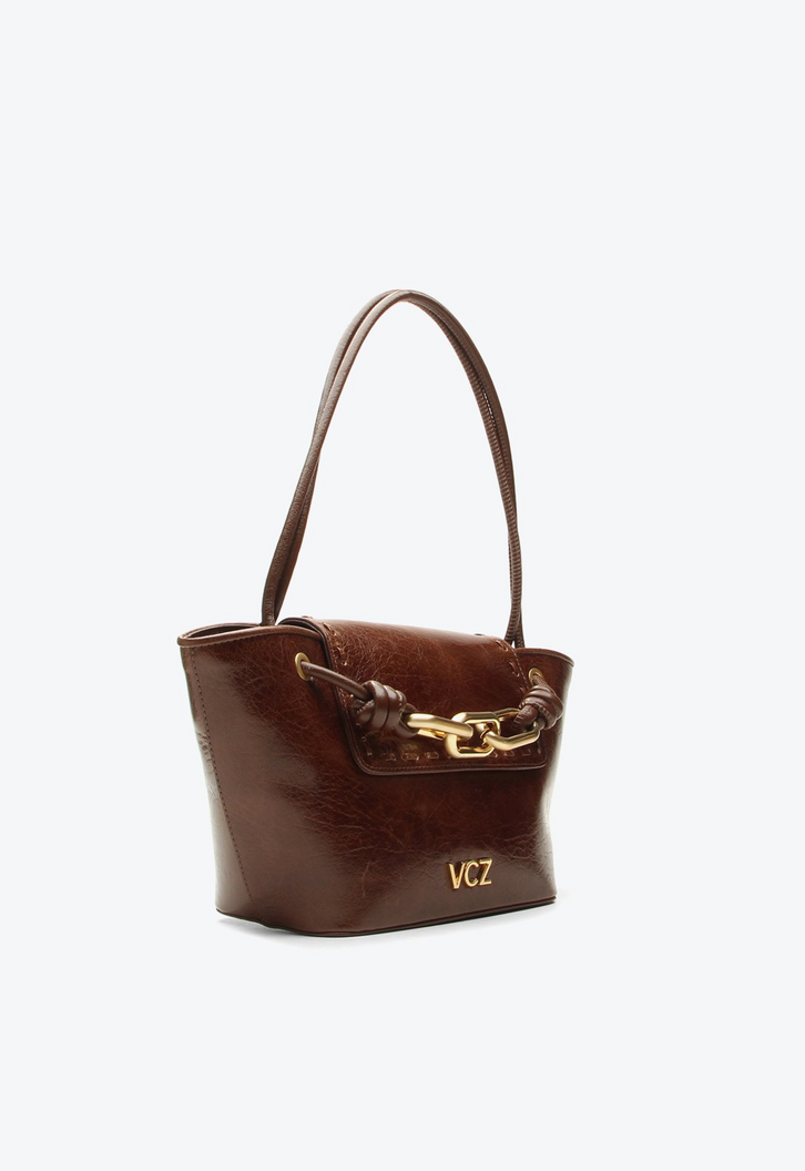 Bolsa média em couro marrom com alça de mão. Chique e cheia de personalidade, essa bag é um must-have para quem gosta de acessórios marcantes. O detalhe em corrente frontal acrescenta um toque boho elegante, tornando a bolsa versátil para complementar todos os tipos de look. Prática e estilosa, ela se torna um destaque nas composições, trazendo autenticidade e charme em cada ocasião.