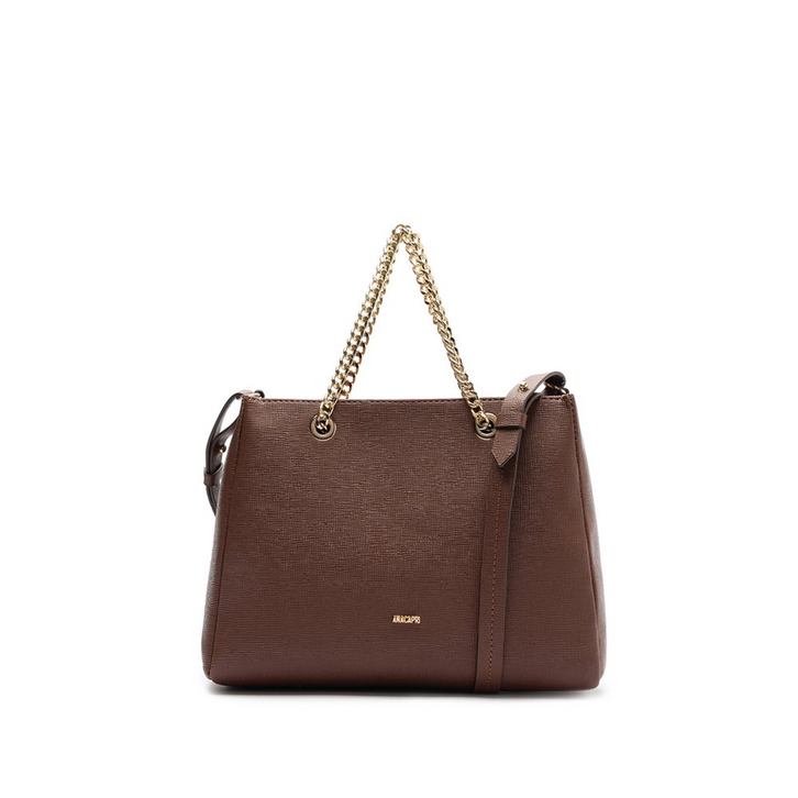 Bolsa tote Amelie média, na cor marrom. O acessório possui shape retangular e estruturado, em material similar ao couro, com acabamento a fio pintado. Traz alça longa, regulável e removível, com acabamento afio - com alças de mão confeccionadas em correntaria imponente, com detalhe de ilhoses. Possui fecho superior em zíper. Apresenta aplicação de pin metálico com assinatura Anacapri, centralizado na parte inferior da capa frontal.
