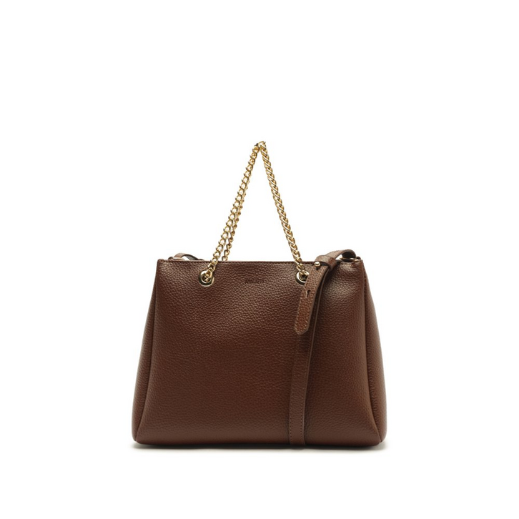 Bolsa tote Amelie média, na cor marrom. O acessório possui shape retangular e estruturado, em material similar ao couro, com acabamento a fio pintado. Traz alça longa, regulável e removível, com acabamento afio - com alças de mão confeccionadas em correntaria imponente, com detalhe de ilhoses. Possui fecho superior em zíper. Apresenta aplicação de pin metálico com assinatura Anacapri, centralizado na parte inferior da capa frontal.