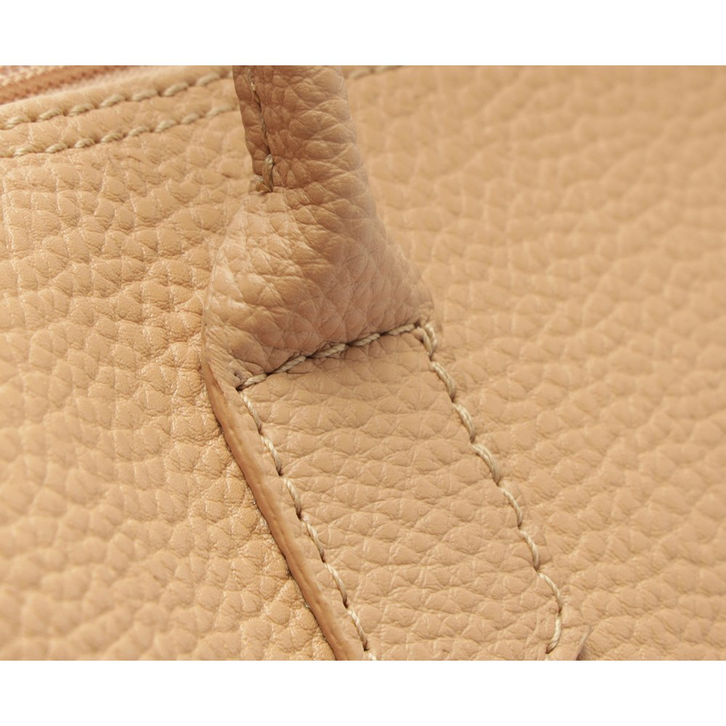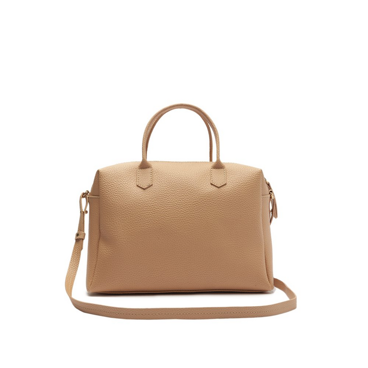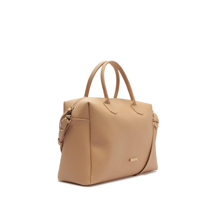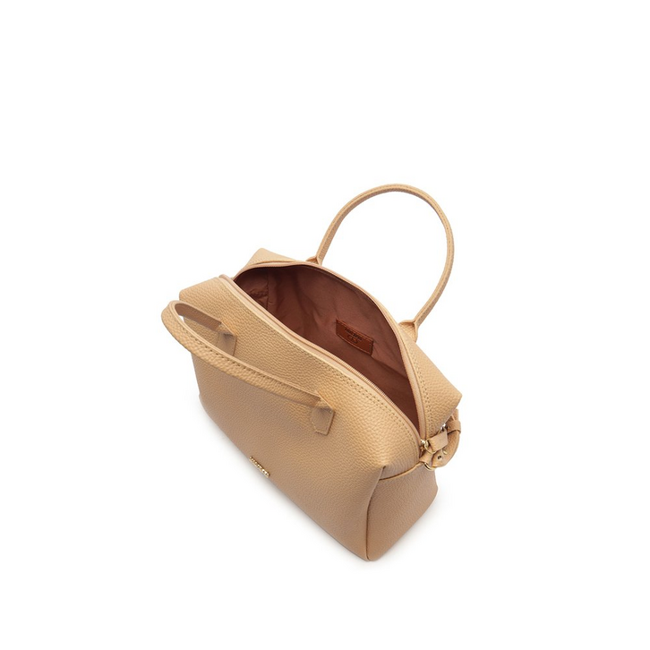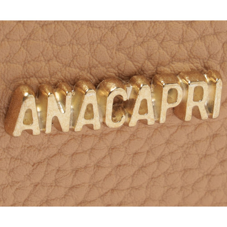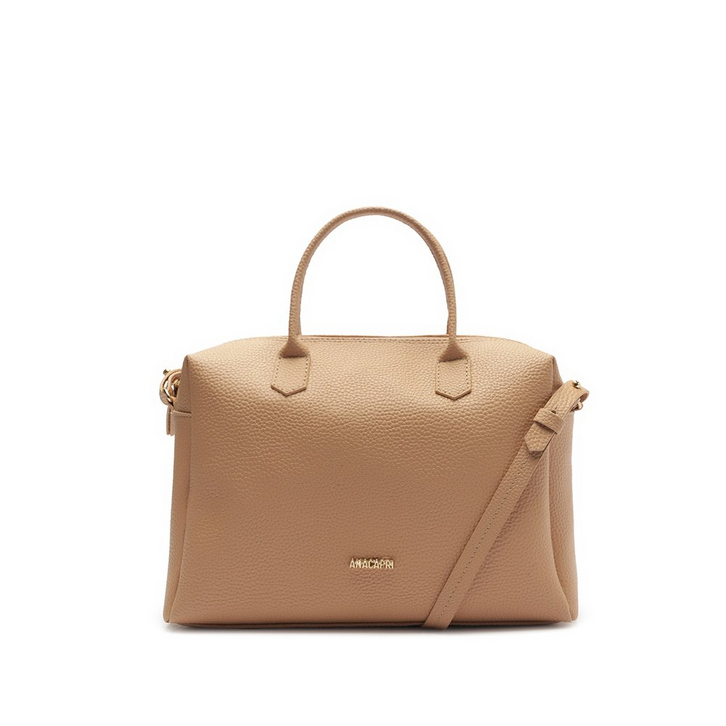 Bolsa tote média e arredondada, na cor bege. O modelo vem para a temporada com shape retangular, com acabamento arredondado nos cantos. No tamanho M, de material similar ao couro soft com efeito texturizado. Traz alças de ombro fixas - com detalhe em costura pesponto - e uma alça longa transversal e regulável. Com fecho superior em zíper metálico com puxador em tira, possui forro em tom rosé na parte interna, traz bolsinho aberto e aplicação de maxi etiqueta emborrachada Anacapri. Apresenta aplicação de pin metálico Anacapri, centralizado na parte inferior da capa frontal.