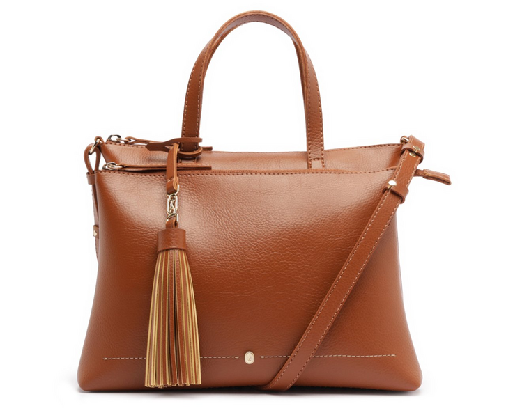 Bolsa tote média marrom, em material similar ao couro. O modelo possui shape estruturado e funcional, com acabamento liso e detalhe de costura ornamental na capa, além de aplicação de rebite personalizado. Traz duas alças de mão arredondadas e acompanha alça transversal regulável e removível, oferecendo diferentes formas de uso. Possui bolso frontal acoplado e fechamento superior em zíper. Vem com bag charm removível em barbicacho, com enfeite metálico em cápsula da marca. Na parte interna, apresenta forro em tom rosé e bolso flat funcional.
