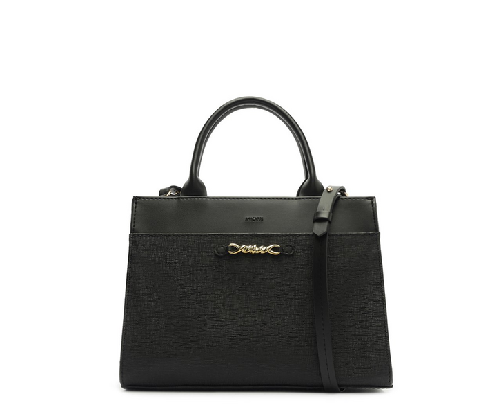 Bolsa tote Vitória média, com divisória e bolso externo, na cor preta. De shape retangular e estruturado, o modelo possui alças de ombro fixas e uma alça longa transversal com regulagem. De material similar ao couro com efeito de textura saffiano em toda a peça, ela possui forro em tom rosê e etiqueta emborrachada exclusiva Anacapri, com a frase: “Leve a vida numa bolsa”. Traz shape best-seller com uma divisória interna e fecho superior em zíper metálico, com puxador em tira. Possui bolso externo aberto com aplicação de adorno metálico central - com efeito torcido. Com acabamento em costura ornamental no contorno de toda a peça, traz assinatura Anacapri em relevo, centralizada na parte superior da capa frontal.