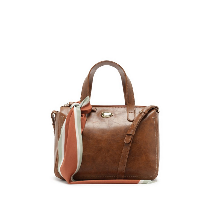 Bolsa tote média, com lenço, na cor marrom. O modelo de material similar ao couro com efeito texturizado, possui shape retangular e estruturado. No tamanho M, traz alça longa transversal, regulável e removível, com alças de ombro fixas. Forrada, apresenta bolsinho interno e fechamento superior em zíper. Traz aplicação de adorno imponente - metálico e personalizado - centralizado na parte superior da capa frontal, com detalhe em costura ornamental, no contorno inferior da peça. A bolsa tote acompanha um lenço exclusivo e delicado com estampa personalizada Anacapri. O acessório é removível e pode ser utilizado separadamente da bolsa.