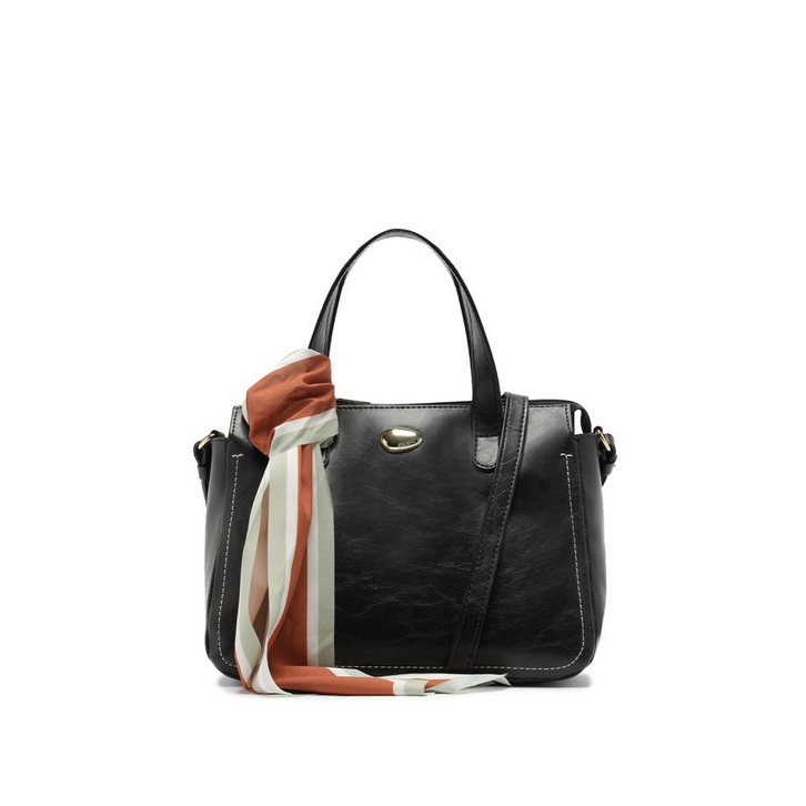 Bolsa tote média, com lenço, na cor preta. O modelo de material similar ao couro com efeito texturizado, possui shape retangular e estruturado. No tamanho M, traz alça longa transversal, regulável e removível, com alças de ombro fixas. Forrada, apresenta bolsinho interno e fechamento superior em zíper. Traz aplicação de adorno imponente - metálico e personalizado - centralizado na parte superior da capa frontal, com detalhe em costura ornamental, no contorno inferior da peça. A bolsa tote acompanha um lenço exclusivo e delicado com estampa personalizada Anacapri. O acessório é removível e pode ser utilizado separadamente da bolsa.